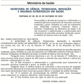 A Comissão Nacional de Incorporação de Tecnologias no Sistema Único de Saúde (Conitec), incorporou os medicamentos INFLIXAMABE E VEDOLIZUMABE para...